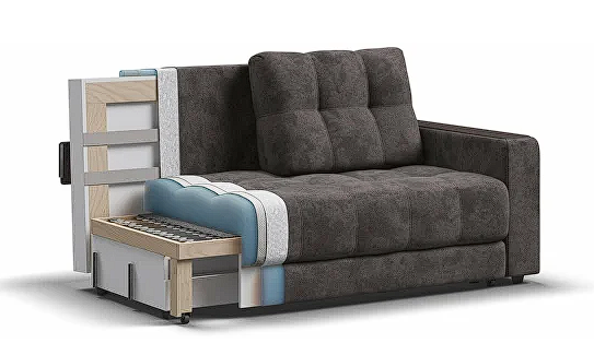 Наполнитель дивана ППУ + пружинный блок «Змейка». Пружины крепятся внутри деревянного каркаса. Толщина ППУ 30 мм. Используется как смягчающий и опорный материал.